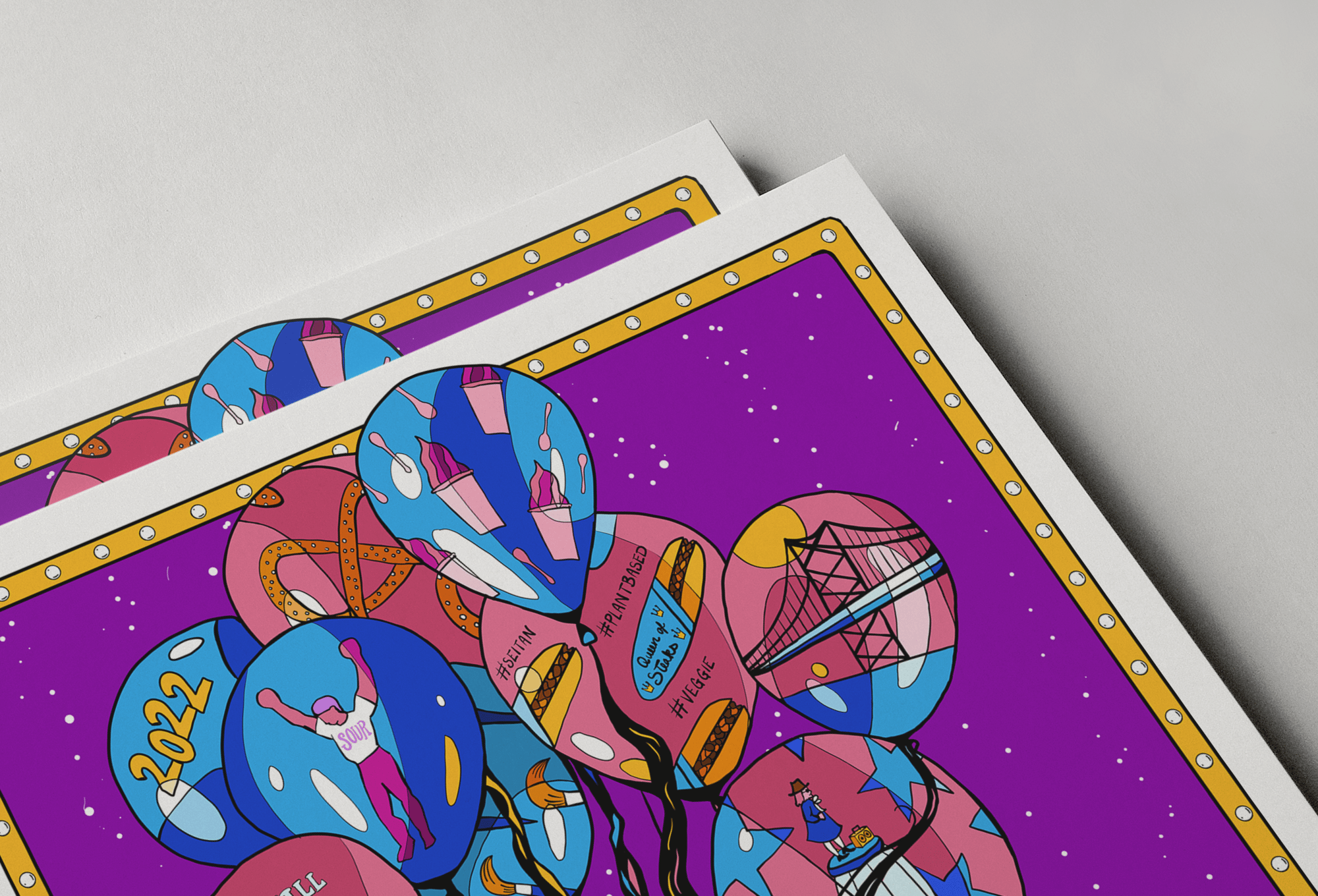 Printed with metallic gold ink, this is a limited run print for Olivia Rodrigo's Philadelphia concert. An illustrated take on her main photo for her SOUR tour, I filled it with hidden gems. I included Philly icons and landmarks as well as little details reflective of her personality, tour and brand.